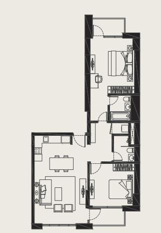 The residences include studio, one-, two-, and three-bedroom units, thoughtfully designed with modern interiors, open-plan layouts, and large windows that allow natural light while offering views of the canal, park, and surrounding community.